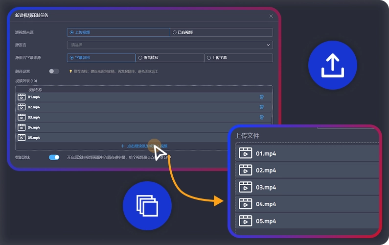 通过 OCR/ASR 技术准确提取字幕文件,也可批量上传本地字幕文件